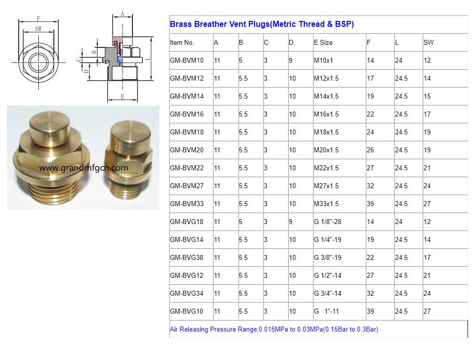 Mechanical equipment fittings M10x1 brass vent plug Air vent valve pressure brass breather vent plug